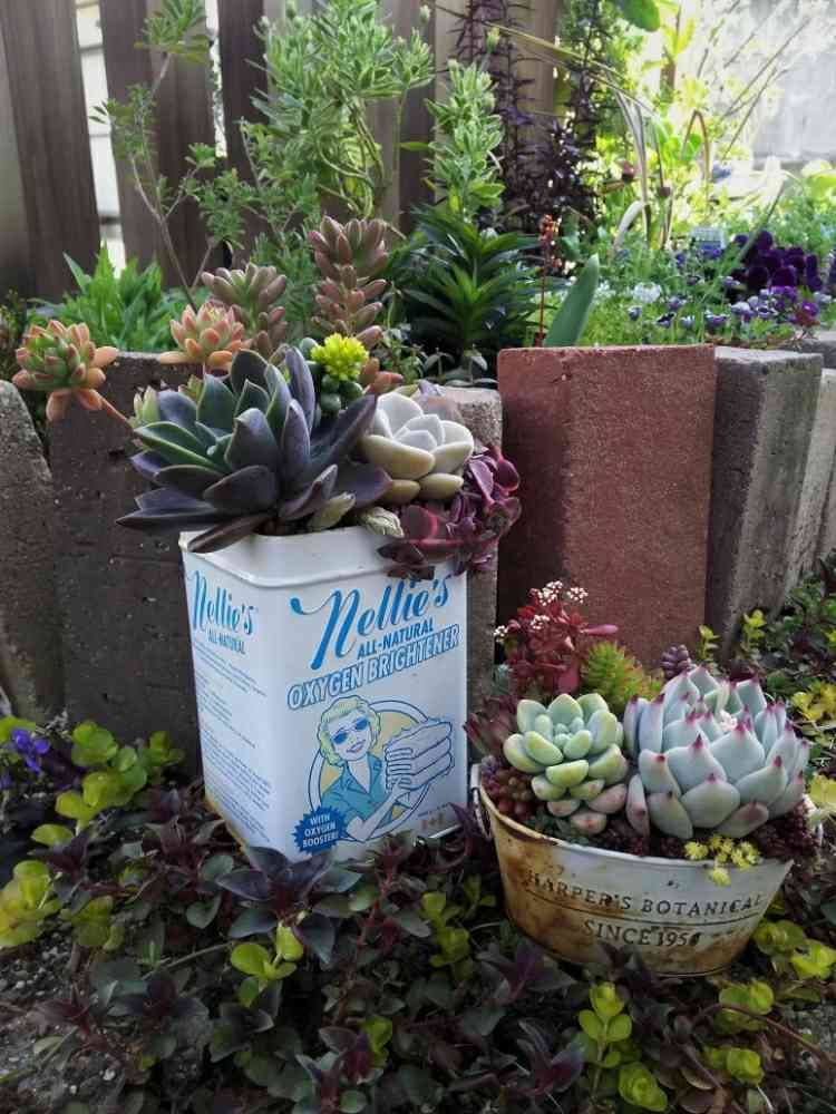 右側のブリキ鉢の寄せ植え、赤色の多肉ちゃん、お花が咲いてるの?✨