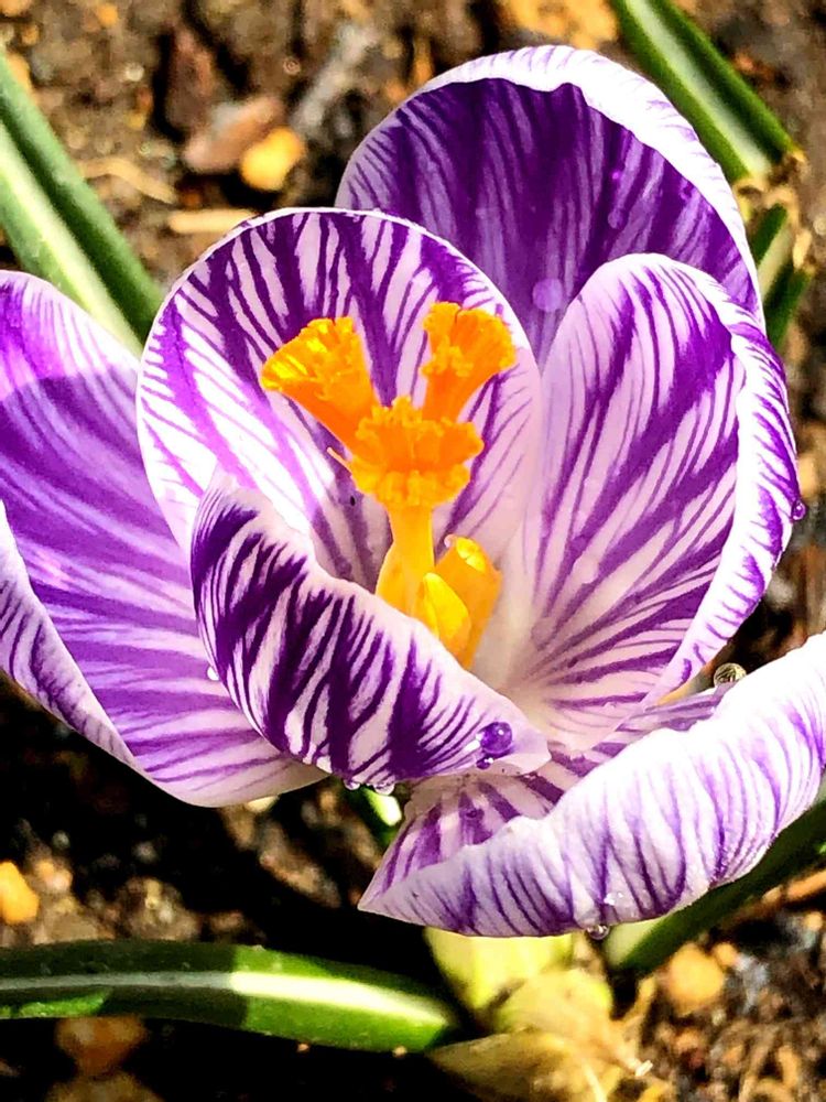 白、黄色、淡い紫色、濃い紫色、白地に紫色のクロッカスが、やっと咲き始めました。その中でもこのクロッカスの鮮やかさは、目を引きます。季節外れの雪にヒヤヒヤしながら見守っていました。今年は葉っぱが枯れてから掘り上げて、増やしてみたいです。