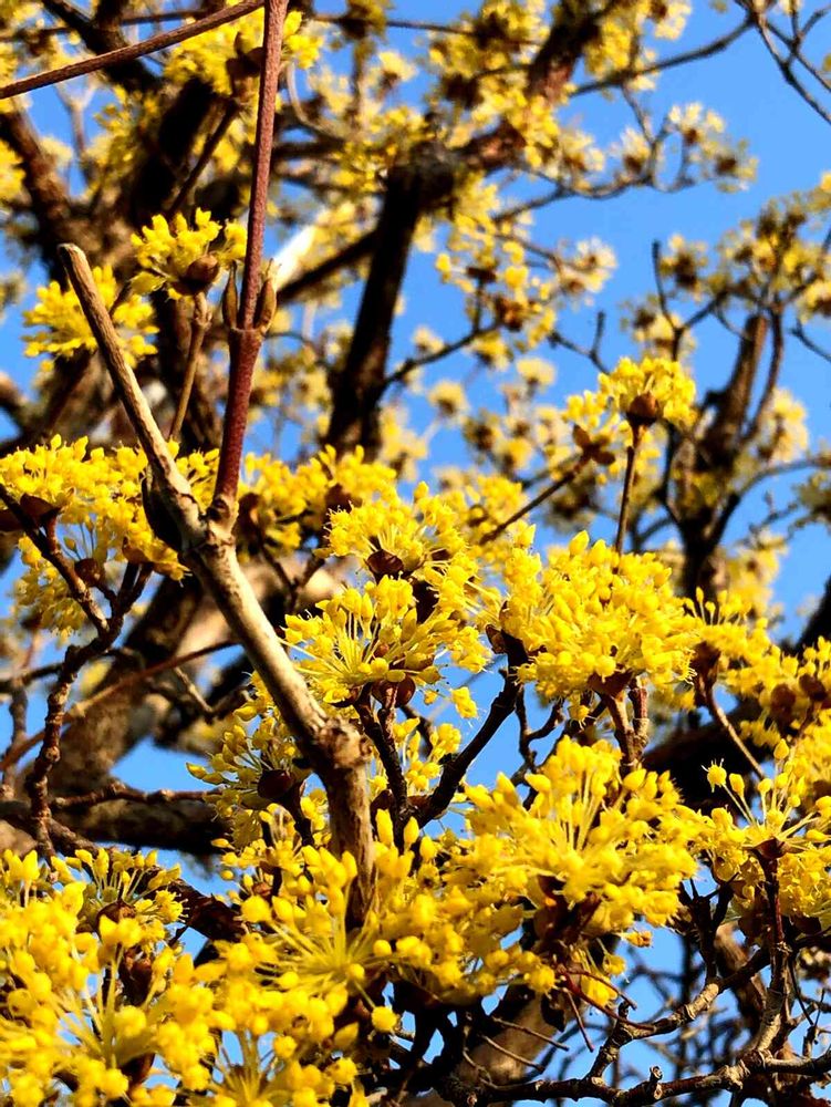 サンシュユは、ミズキ目ミズキ科の落葉小高木。近くで見るなら、真下がオススメです。葉っぱが付く前に、黄金色の花が天空に向かって駆け上がっていく様子が、素晴らしいです。更に、背景が青空ならもっと良いです。別名のハルコガネバナがぴったり。秋に赤い実がなる為、アキサンゴやヤマグミとも呼ばれています。