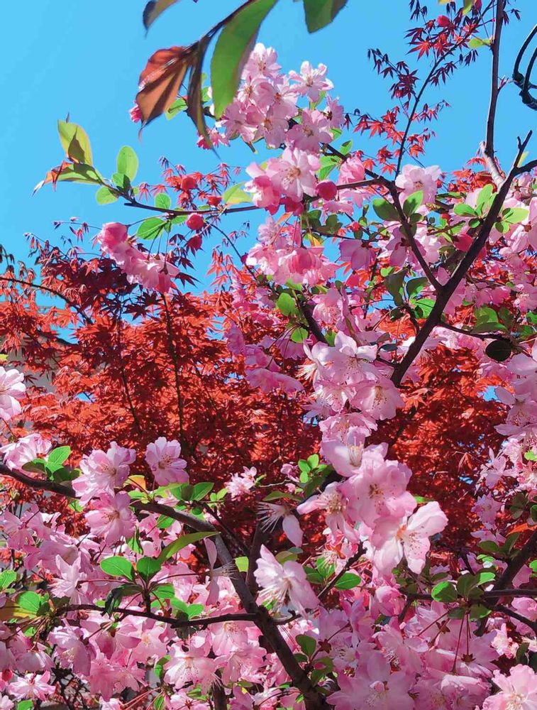 今が一番見頃なカイドウと紅葉です🌸🍁🎶周りの家を写さないように撮ったら謎な構図になってしまいました💦笑