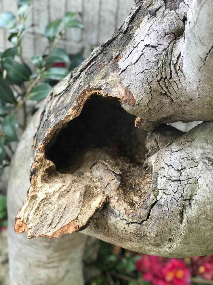 解決になってないかもしれませんが、穴より下で、接木か通し接ぎして再生させるのはどうでしょうか?