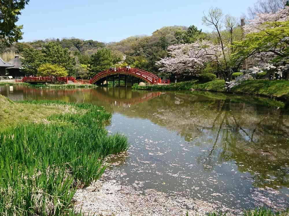 朱塗りの橋や桜🌸の花が水辺に映る綺麗な様子をスマホ📱でも写真におさめることができました。