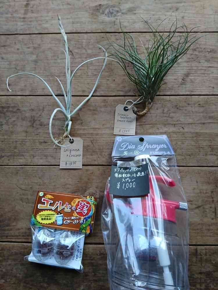 左上はカリギノーサ×クロカータの交配種、右上がテヌイフォリアエメラルドフォレスト、左下はエルセの実と言ってこれを水の中に入れて十回位容器を降りエアプランツの葉っぱにシュッシュッ散布するとよいので買いました、右下は霧吹きですがもちろん持っているんですがエルセの実を入れるのに今持っている霧吹きだと実が入らないので一緒にお買い上げしました!👍。
