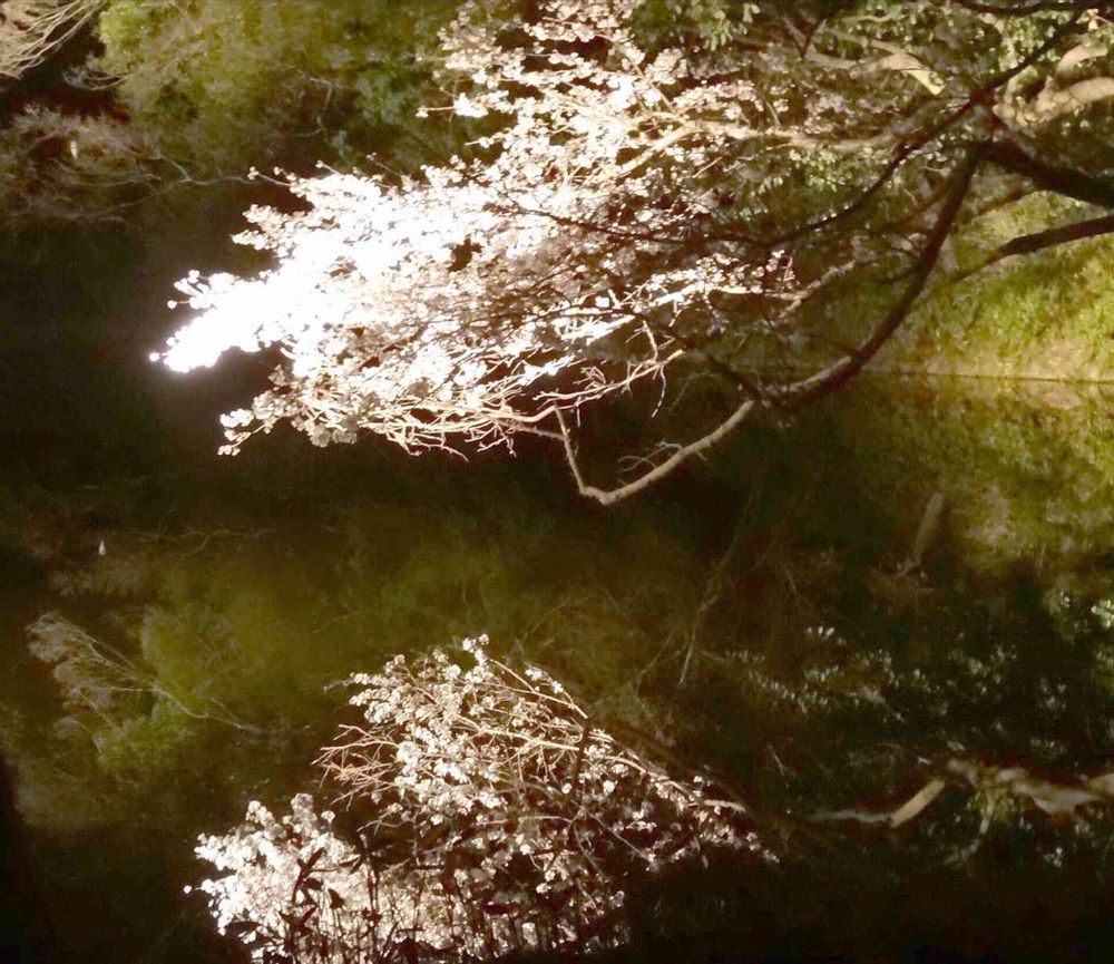 桜や樹々がライトアップによって湖面に浮かび上がります。