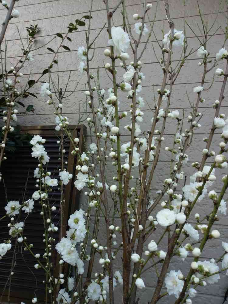 冬の間に庭から玄関先に移植した照手桃が頑張って咲いてくれた。