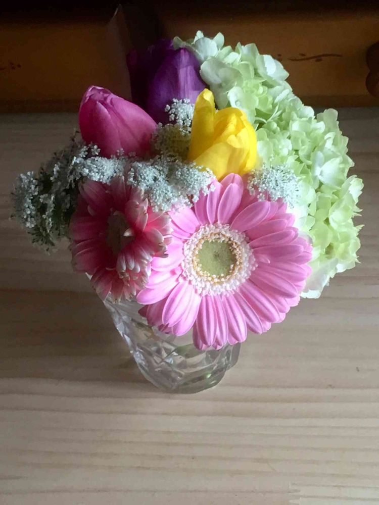 アジサイ、スプレーフラワーに背を出したチューリップ、ガーベラさんのピンクが優しいくて華やかですね❤