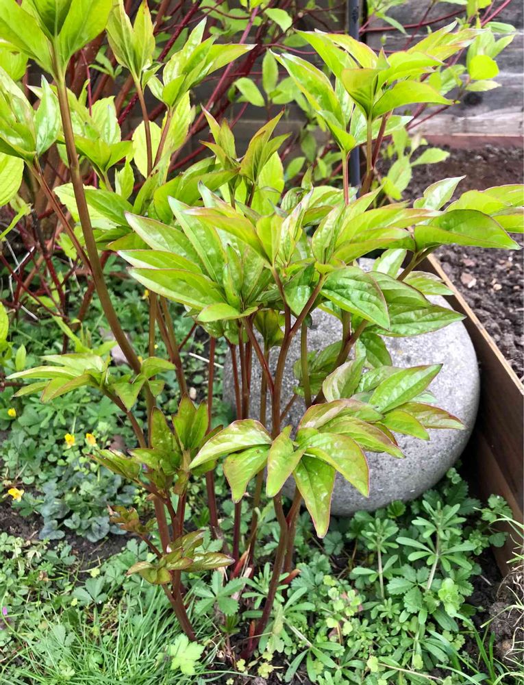 庭に三箇所植えてあるシャクヤクのうち、白いシャクヤクの芽が赤から緑に変わっってぐんぐん伸びています🌱