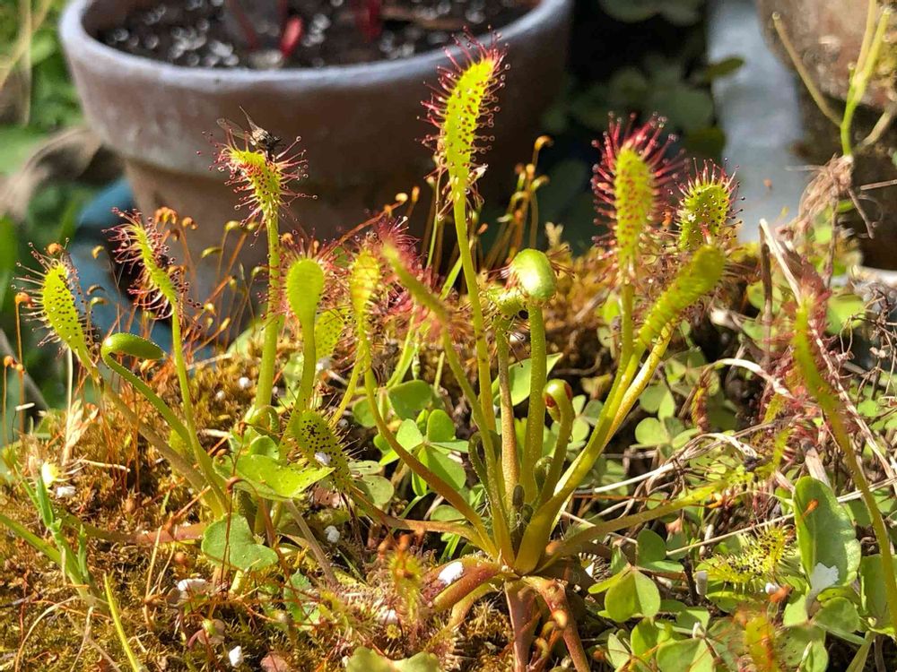 休眠から目覚めて元気なナガバノモウセンゴケです。植え替えようと思っているミミカキグサの鉢にこぼれて生えた株の方が調子良く育っちゃいました。なので、カタバミと同居です😅。