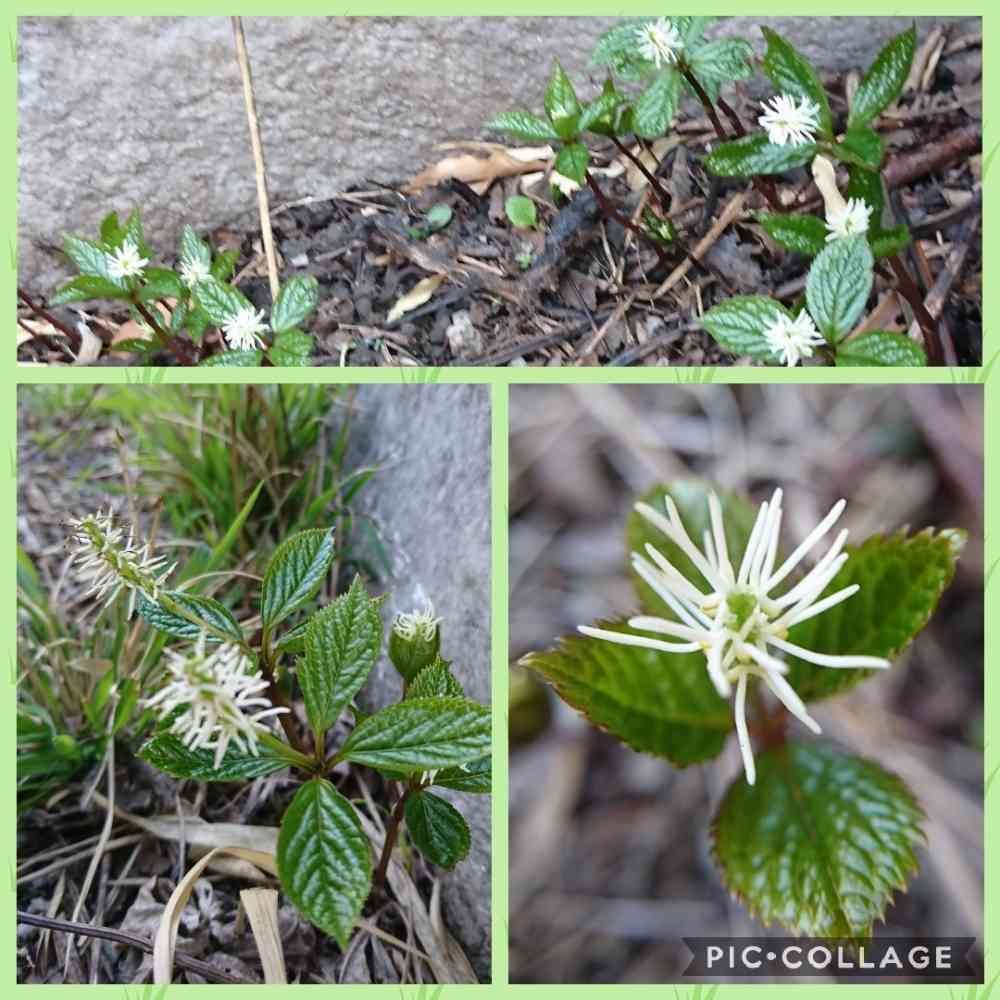 春先 4枚の葉を突き抜けて、 白いブラシ状のとても変わった花を1本咲かせる