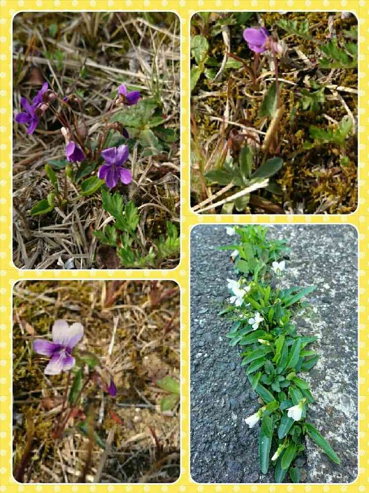右下の白いスミレは、道路の端っこにありました。車に踏まれませんように…。