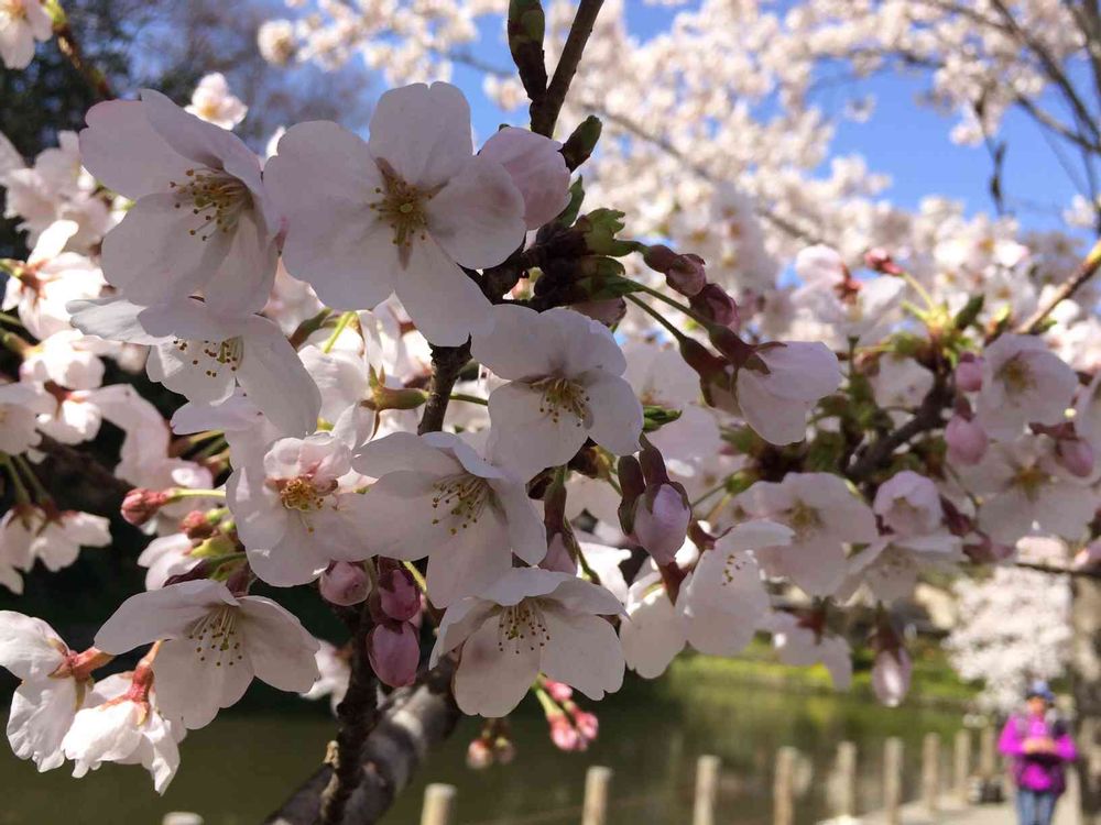 お城の裏の大手掘沿いに咲いている桜の花はまだ五分咲き位でしょうか。でもこの位がつぼみも見られて愛でるには丁度いいかも。