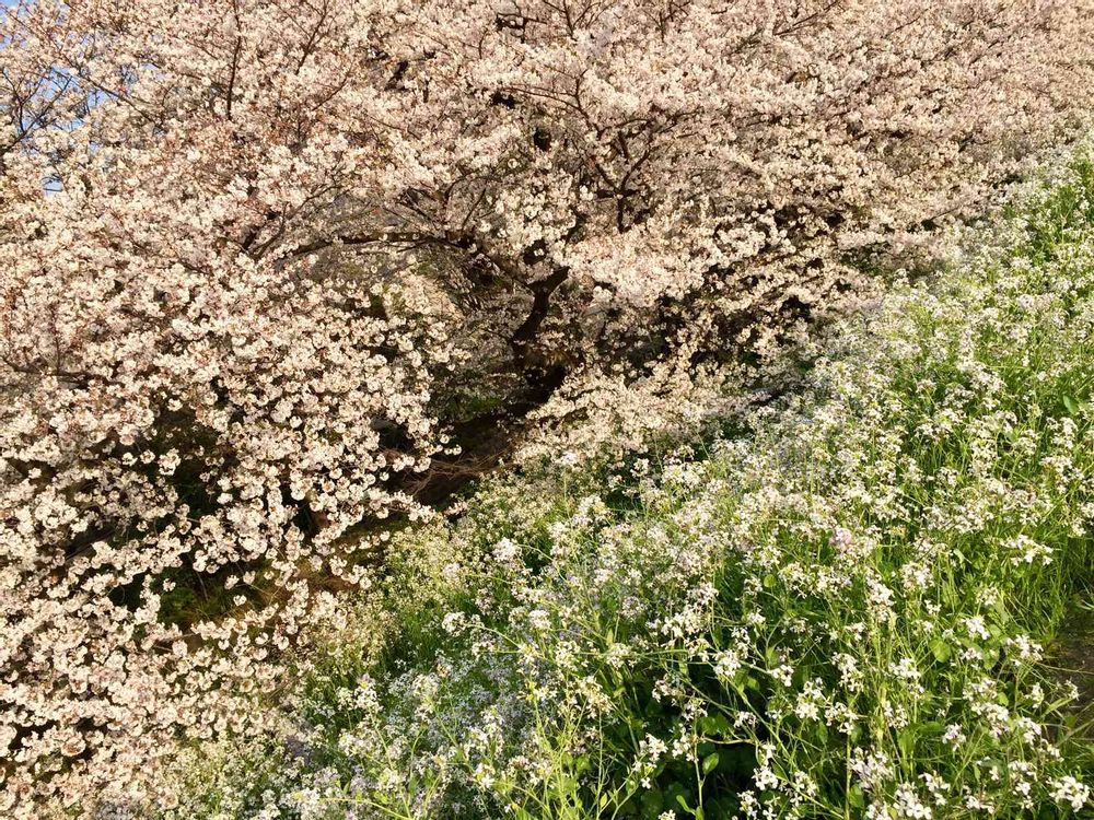 たくさんの桜の木と土手に咲くハマダイコンの花畑の競演😚💕