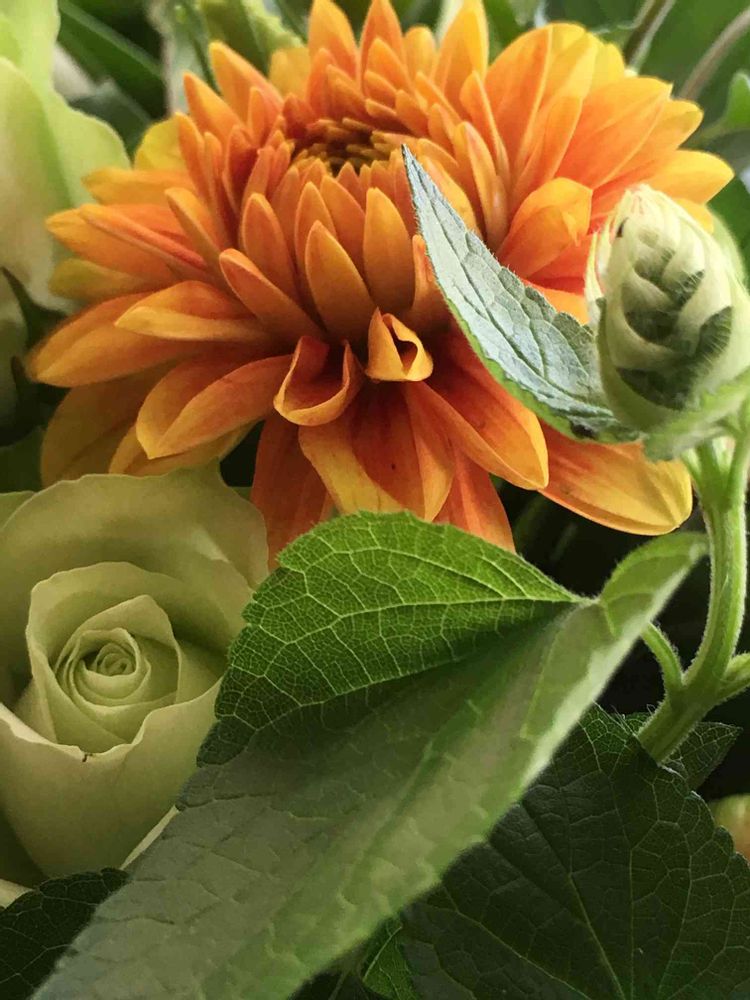 グリーンのバラ とシックなオレンジが優雅です~。素敵✨