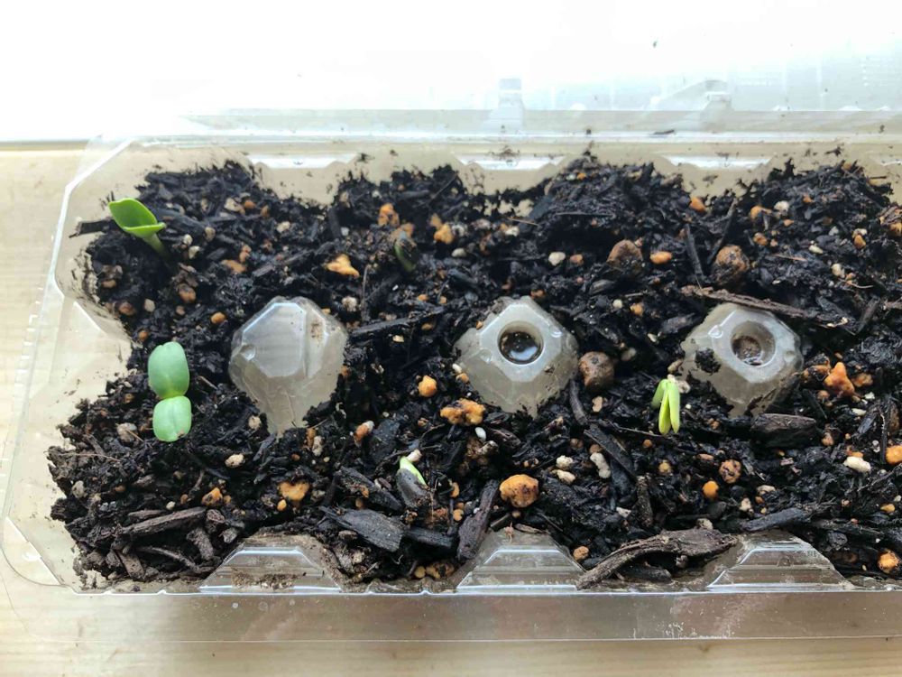 ひまわり🌻の発芽にはちょっと寒いかなと思って、卵のパックに種を一個ずつ入れ基本家の中でぬくぬく育てました😄