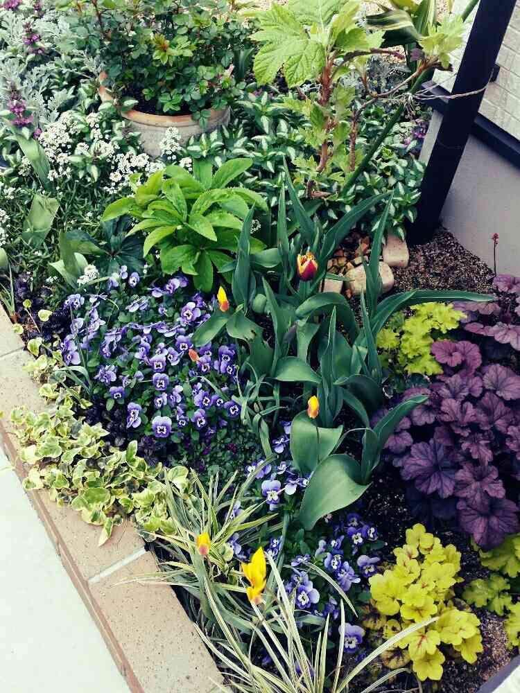 花壇がもりもりしてきて嬉しい限りです。ビオラとアリッサムが花盛り。クリスマスローズは今年は咲きませんでしたが綺麗な若葉がたくさん立ち上がり、アクセントになってます。