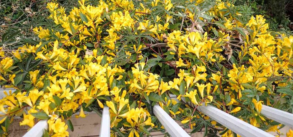 二階のベランダから見下ろした、カロライナジャスミンです。緑のカーテンはいいけれど、ちょっと茂りすぎかも💦まだ春になったばかりだよ~ん🤣
