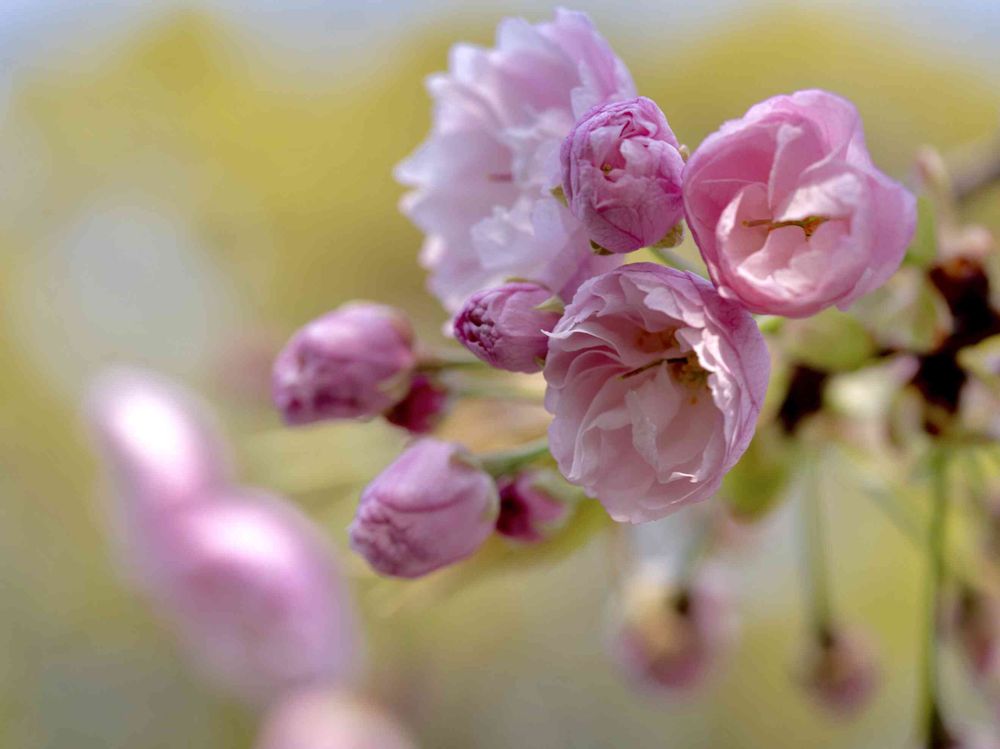 淡いピンク色の八重桜、一葉。