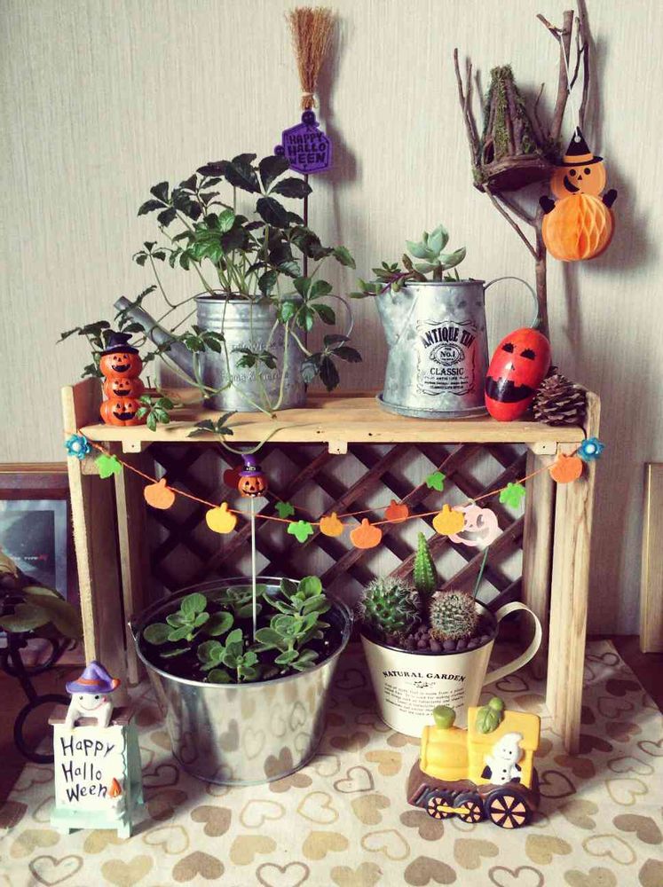 100均すのこで棚を作り、南瓜は無いので烏瓜の実に顔を描いて置いてみました