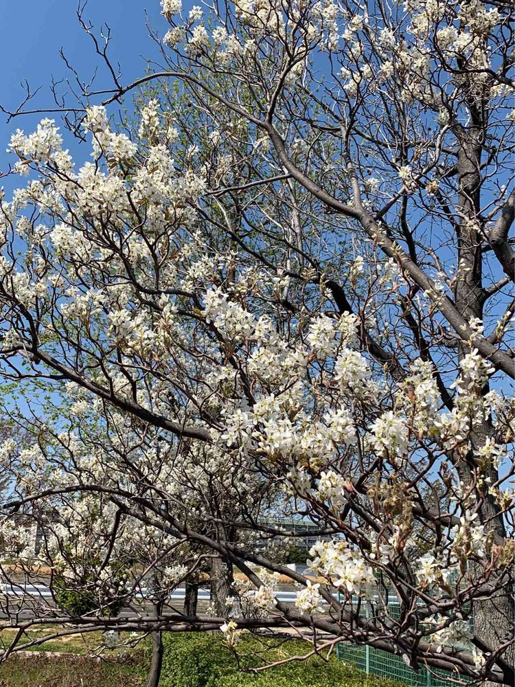 代わって、アメリカザイフリボク(ジューンベリー) の花が満開です。葉は灰色がかって緑に見えません。花が終わると、実がなります。去年食べてみましたが、小さいので、ジャムにいいかもしれません。