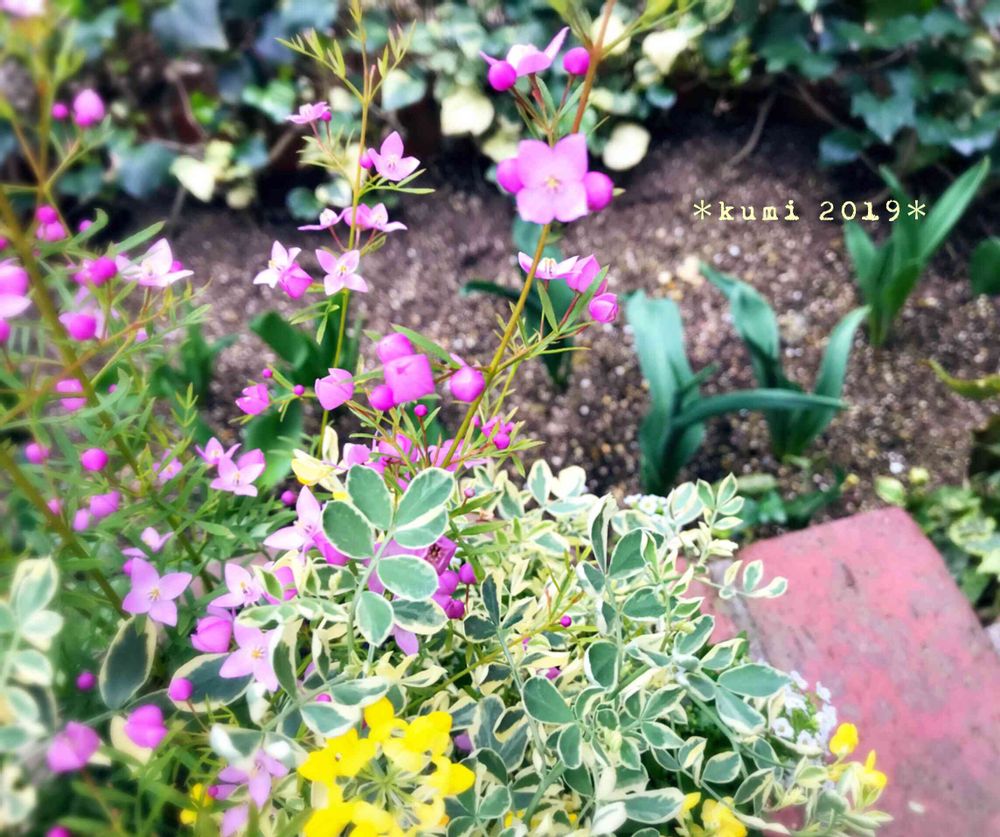 ボロニアが枝の先まで咲いてきましたね〜😊🌸🌸🌸柔らかなピンクで、可愛い〜です♡コロニラさんも元気ですね!斑入りと黄色のお花に元気をもらいますね〜😊🌼☘️