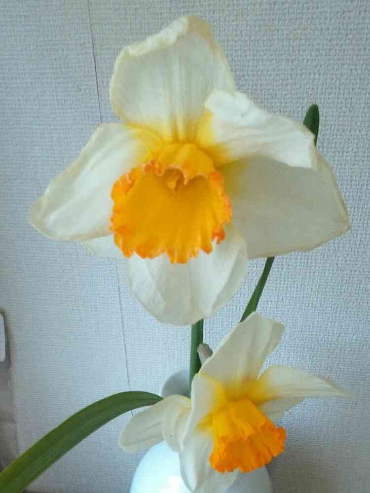 ラッパ水仙の白3月撮影、庭から切り花にして白の花瓶に挿してみました、水仙の切り花は長持ちするな!