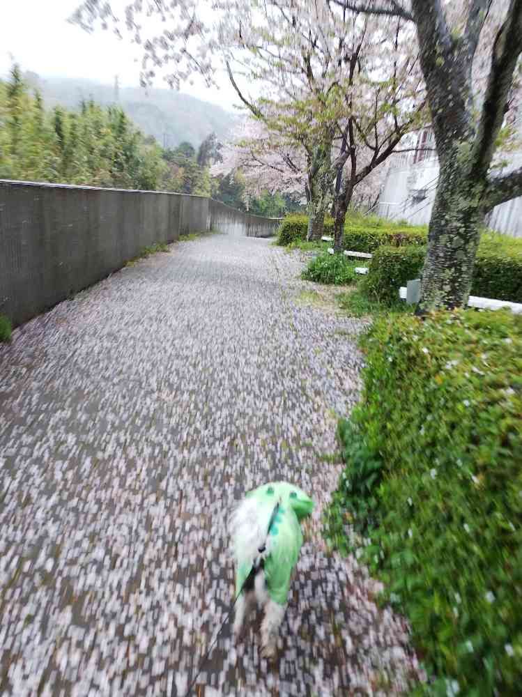 雨の中、桜の絨毯を駆け抜けるガチャピン😄