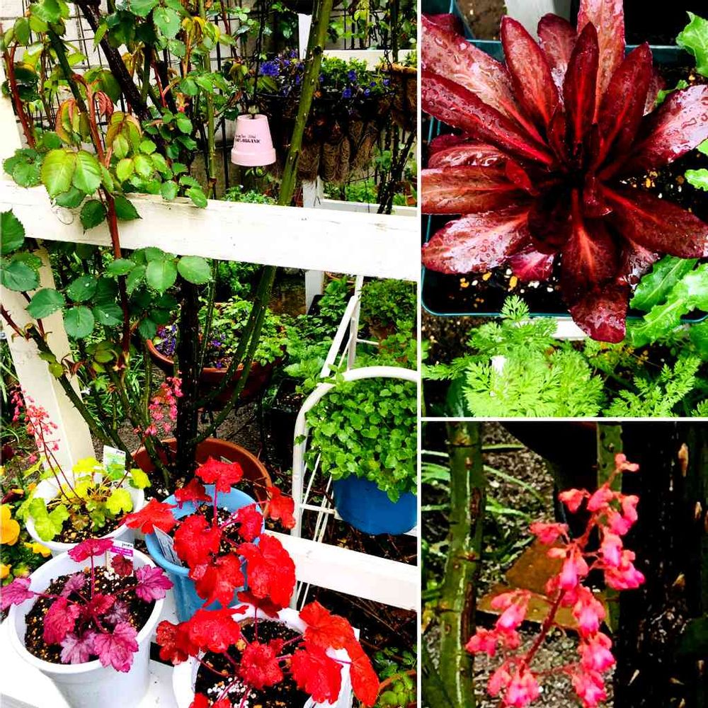 ライムグリーンのヒューケラには、真っ赤なお花が咲いています。