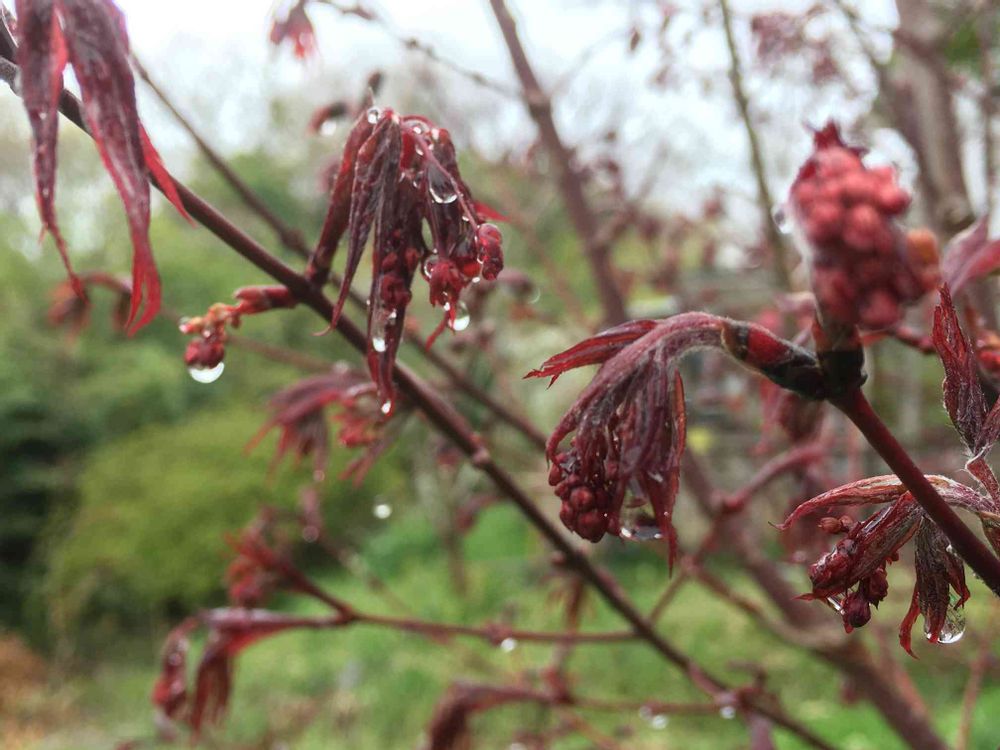 (1) 新芽の時から赤いもみじ🍁と雨雫💧