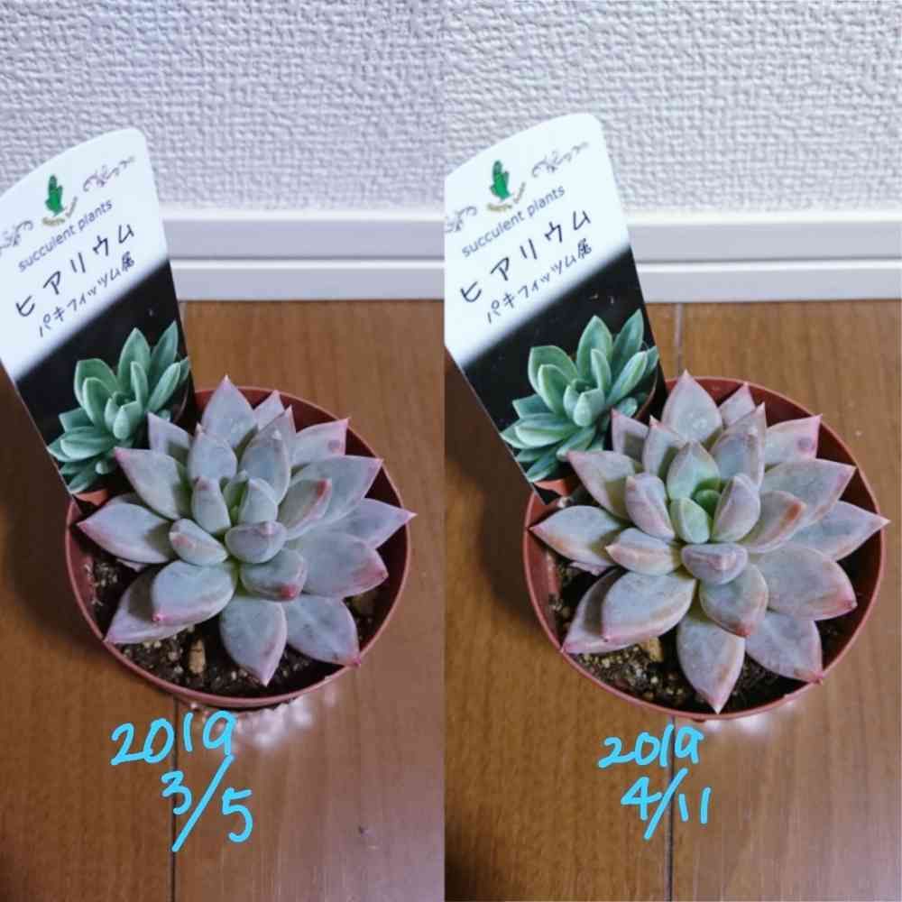 こんばんは🌃多肉さんの成長ってゆっくりだから、こうして比較すると成長具合がよくわかります🙆🍀最近暖かくなってきたので、しっかり水やりしたらもりもりしてきました😆💖