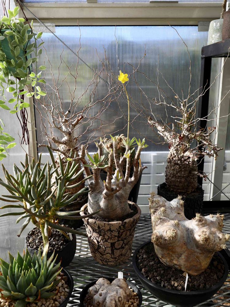 何時もだと外に出して並べるのですが、今朝は風が強く半分ほどは温室の中でした。