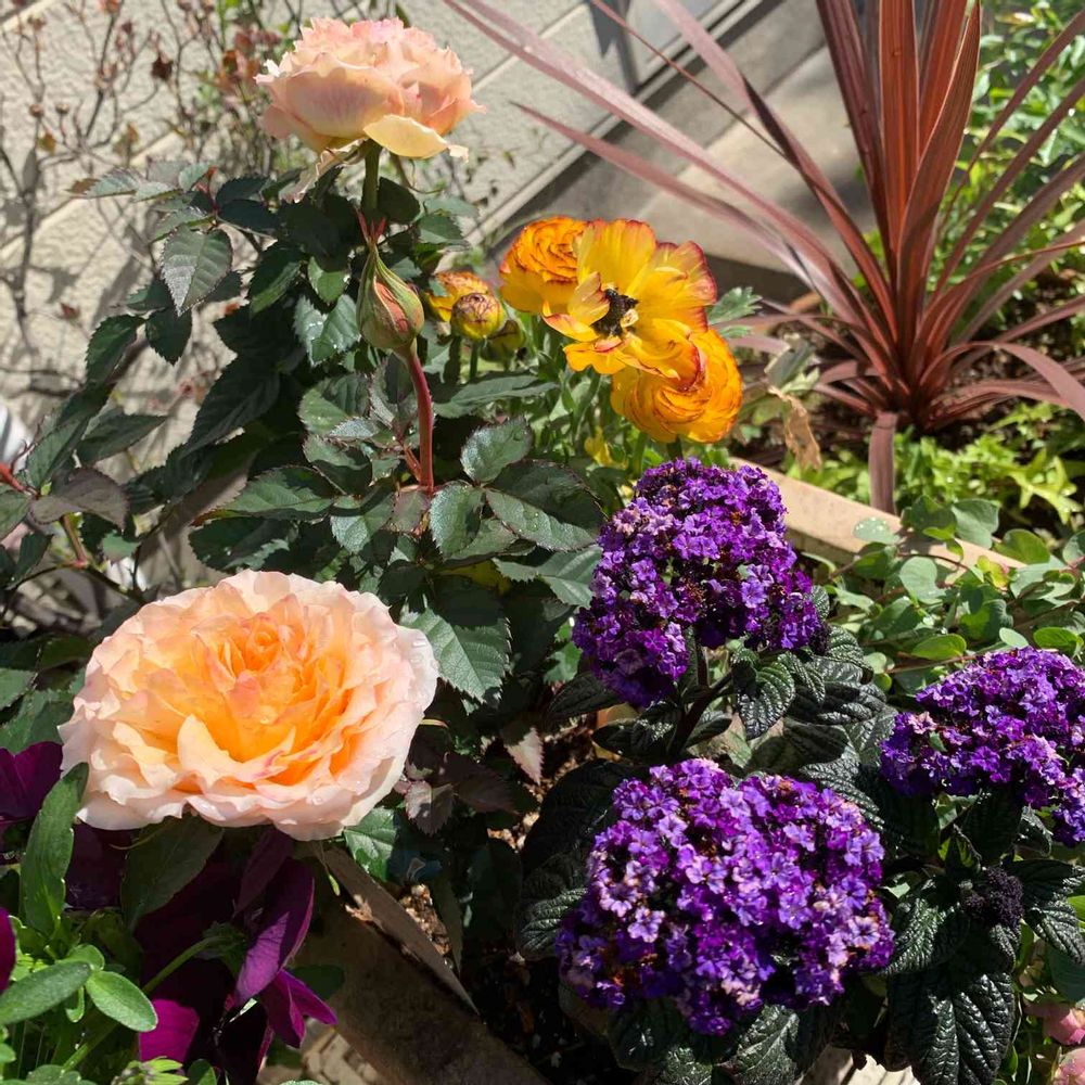ヘリオトロープ、花オレガノ、ラナンキュラス(マシェ.イエローレッドバイカラー)の寄せ植え。