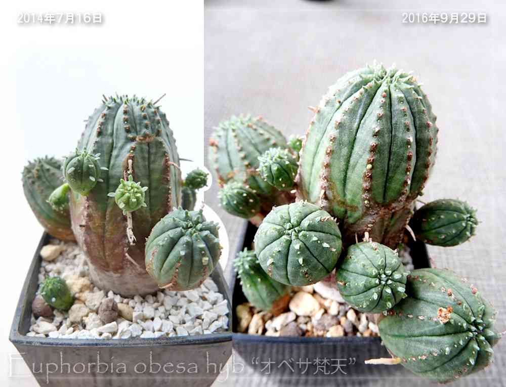 オベサ交配種・オベサ梵天。同じ名前だけれど交配相手が違う、タイプ違いがあるみたい。これは、やや柱状に伸びて、子吹きする様子から見て、たぶん紅キリンあたりがまじっていそう。それでいてオベサのぽってりした感じが出ていていいかんじ。これも買った当初と比較してみた。角度を合わせ切れなかったけれど、関係ないくらいの成長っぷり。これも来春植替えかな? 置き場所に困りそう~!