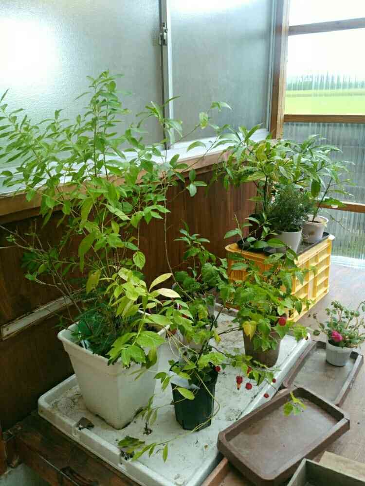 アブチロン、クチナシ、お茶の木、ナイトジャスミン、休眠中のタイツリソウ赤と白、エリカ、ノウゼンカズラ、デュランタ、カランコエ、クラリンドウ、インパチュンス、ブーゲンビリア。