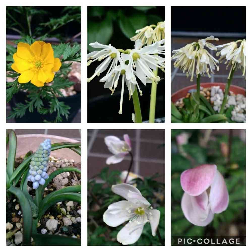 福寿草(キンポウゲ科)、ムスカリ(ユリ科)