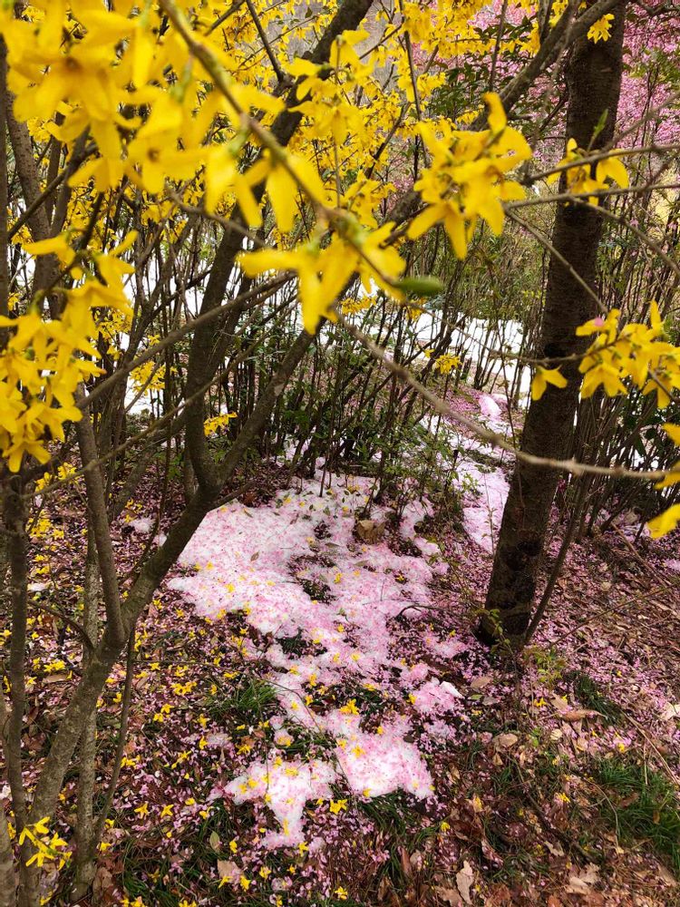 レンギョウの黄色と雪の白に、ピンク色の桜🌸の花びらが素敵でしたよ🥰
