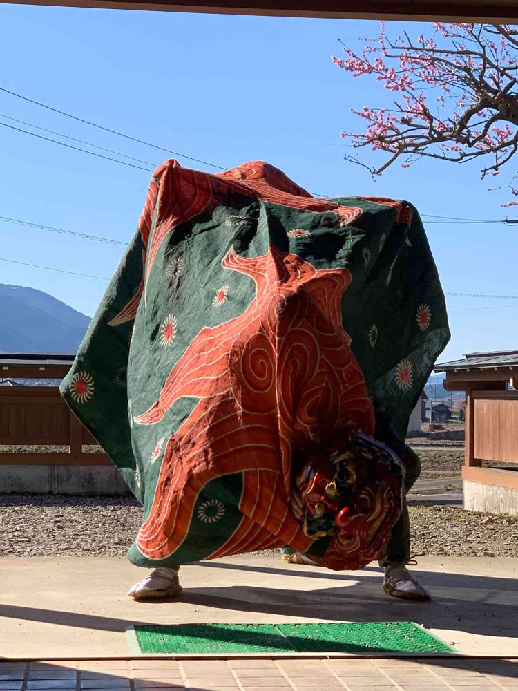 毎年、全部で6匹の獅子が朝早くから手分けして全部の家を舞ってまわります。写っていませんが、もちろん笛太鼓のお囃子つきです😅