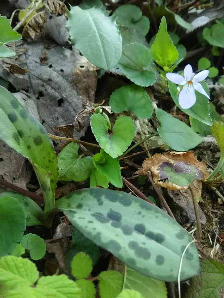 春に咲くスミレの側で、秋に咲くヤマジノホトトギスが準備している