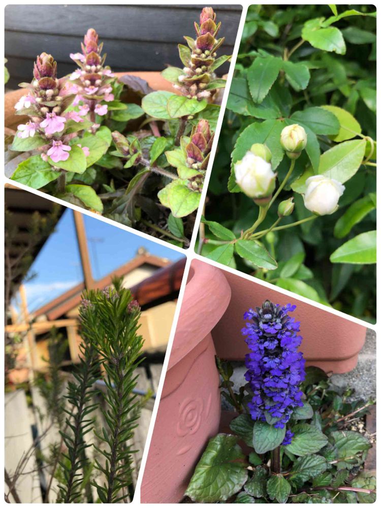 割れ間から出たアジュガが鉢より先にグングン伸びて💖
