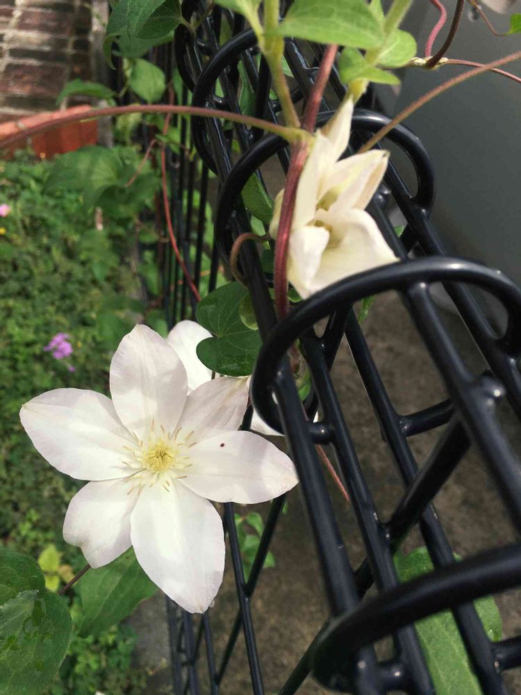 これはフロントgardenですが、南gardenに、11年前に初めてクレマチスを植えたのが、白雪姫とクレマチスのダッジェスオブエジンバラでした。