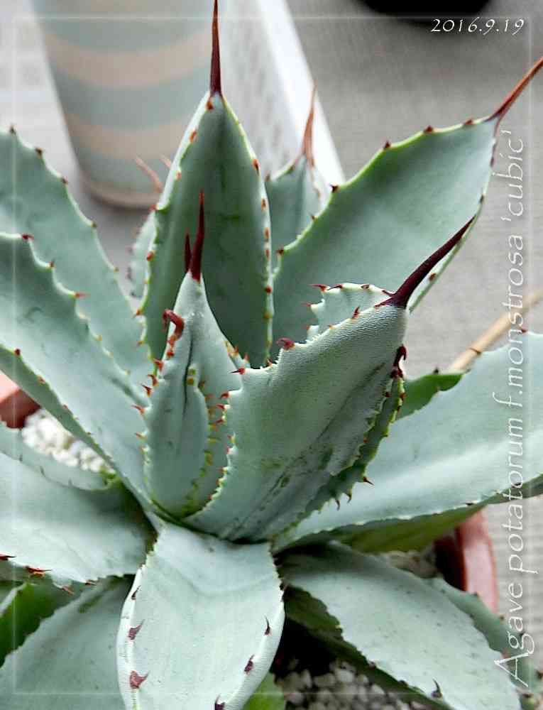 アガベ・ポタトラムのモンスト、キュービック。一時期ちょっと元気がなかったけれど、水をお目にやるようにしたら元気が出たような気がする。ちゃんとモンストな新葉を出してくれてるし。春に植え換えているけど、植替え前より大きくなったかな?