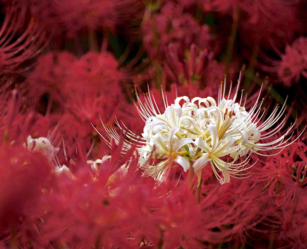 沢山の赤い彼岸花の中に白を…素晴らしい演出ですよね^_−☆