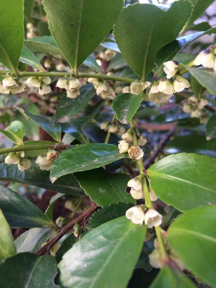 榊とヒサカキ(関東以北ではサカキとして販売されているそうです。)は別の樹木らしいです。葉っぱがギザギザしているとヒサカキだそうで、たぶんこれはヒサカキだと思います。ちょっと小さめで姫榊と呼ばれる事もあるようです。
