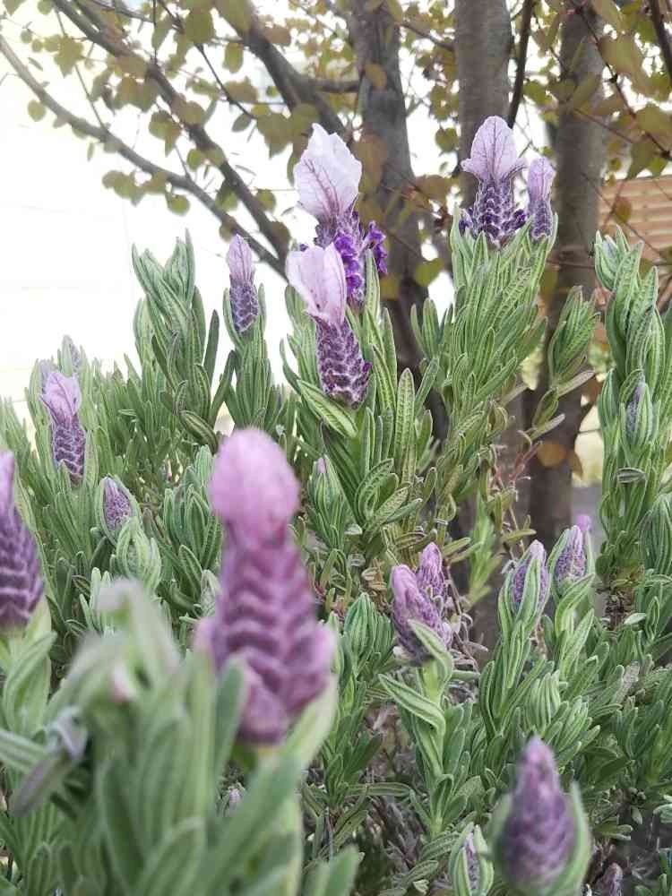 我が家のフレンチラベンダー、やっと咲き始めました。🌸後ろの木はカツラです。🍃