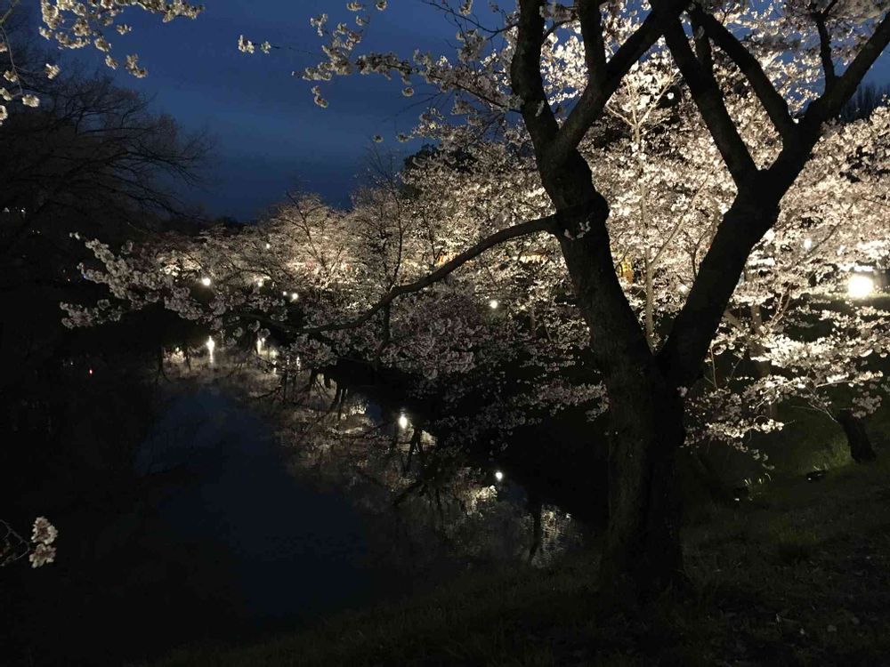 夜の闇に浮かび上がる桜、水面に映る桜、どちらもとっても素敵です🌸✨