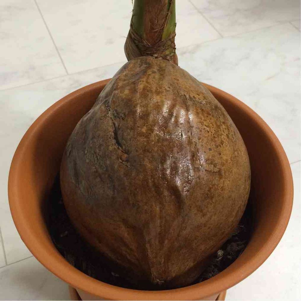 ヤシのタネにそそられて思わず買ってしまったが、茎の出方が片寄っておりしかも既に2メートル近く伸びているので非常に不安定。プラスチックの鉢にも一因があるため植え替え用の鉢を物色中だが、うまく育つのかなぁ〜?