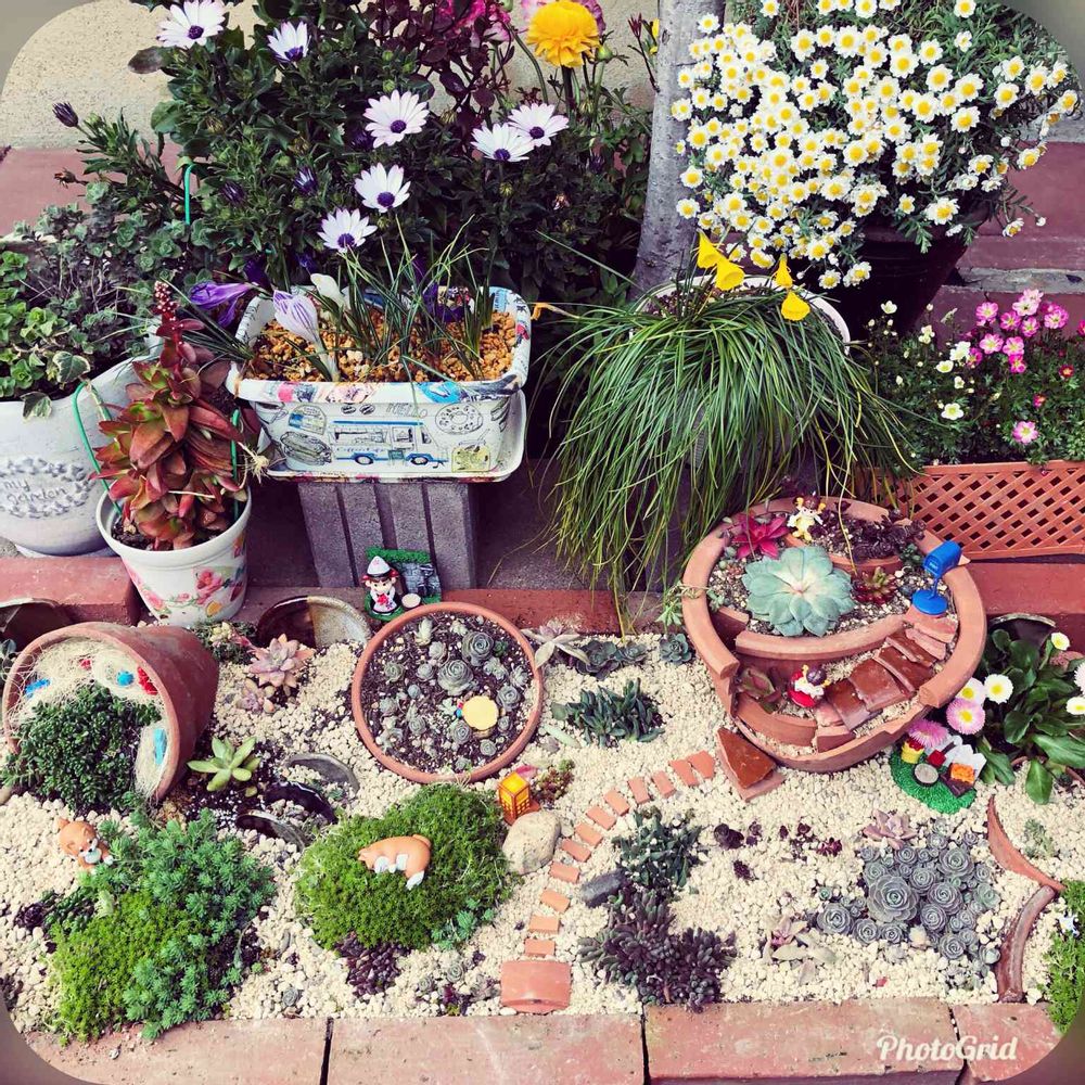 地植えで増えたセダム・子持ち蓮華を植木鉢に入れたり、ブロークンポットを仕立て直して置いてみたり😘