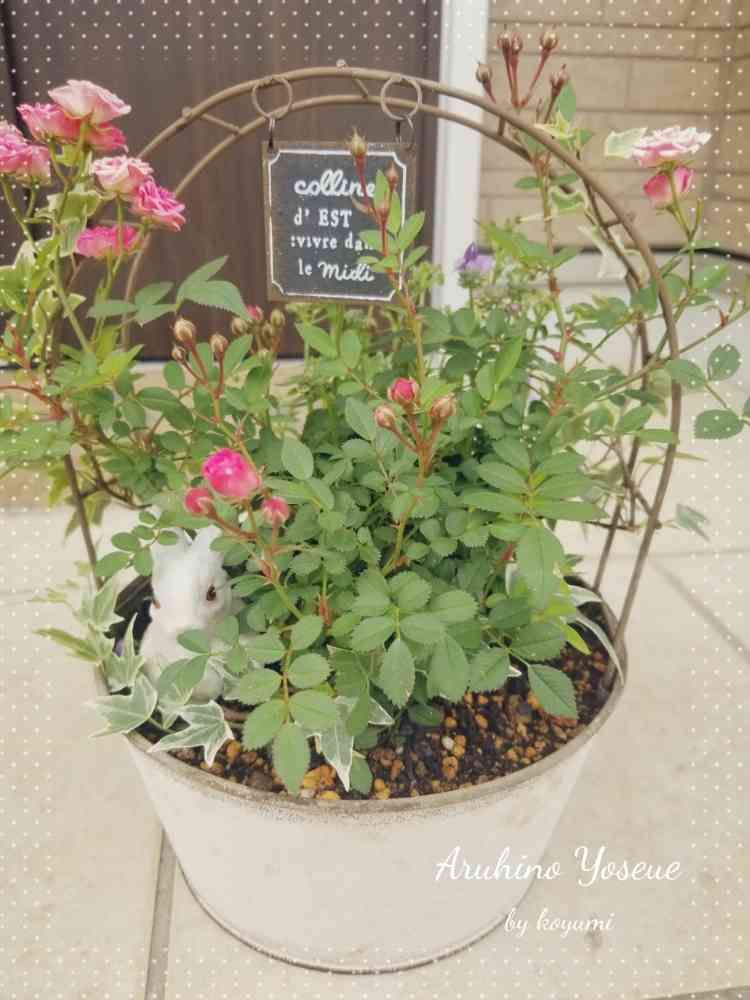 ミニバラとヘデラ、アーチに絡むかな🎶o(^o^)o🎶
