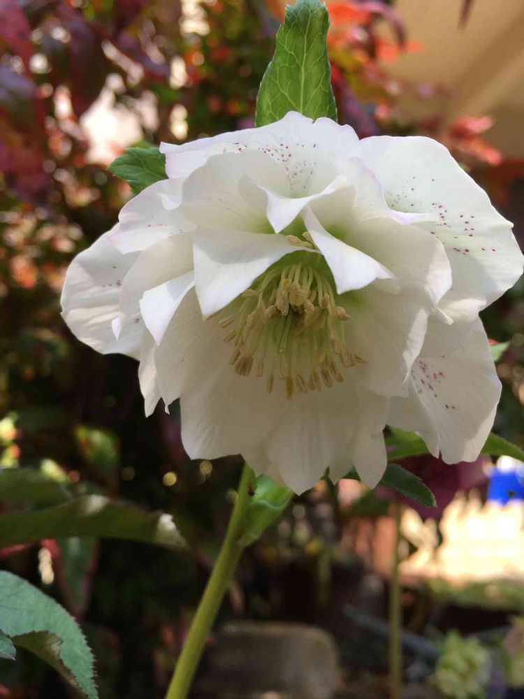 八重咲き・スポットの白色クリスマスローズです。外側の花弁の内側だけに小さなスポットが見られるのが特徴的です😊💕。