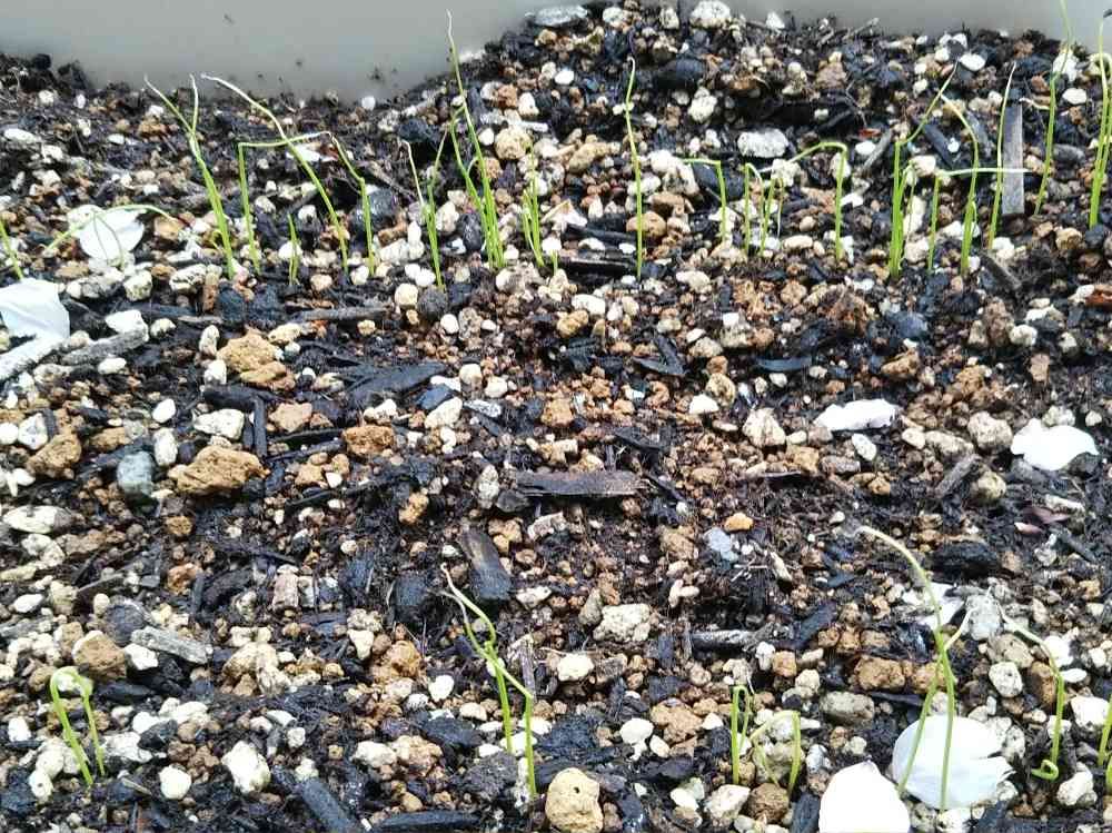 【九条ねぎ】水菜と同時に種を蒔き、1週間強遅れて漸く発芽。最初の発芽から2〜3日経つと、ネギらしい雰囲気の芽が出揃った。