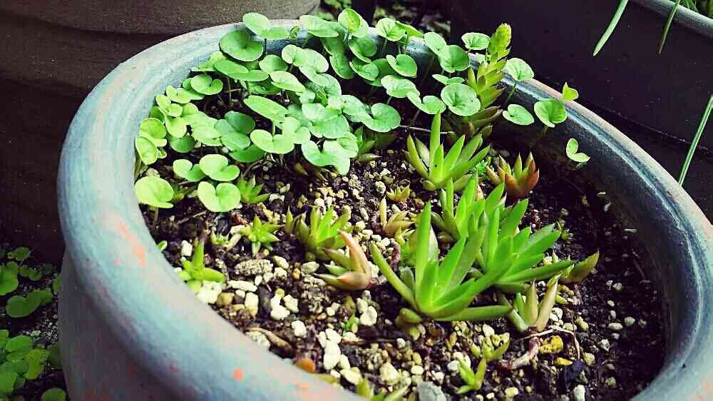 爪蓮華のポイポイ鉢に丸い葉っぱ(名前忘れた)もやって来て賑やかに…(*´艸`*)